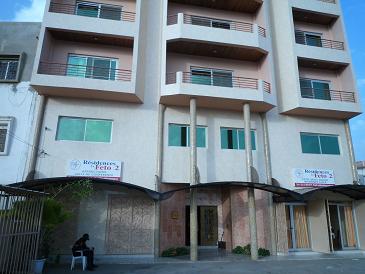 ホテルからの迎えの車で、ホテルまで約10分弱。ホテル(Le Feto2)は、ダカールの市街地からは北に外れた新興住宅地(?)のようなロケーションにあり、5階建ての新しい建物でした(写真)。宿泊は、朝食付きで1泊1人35ユーロから40ユーロ程度ですが、いくつかの部屋にはゲストルームみたいな部屋がもう一つついており、日本のビジネスホテルよりも随分立派なホテルです。