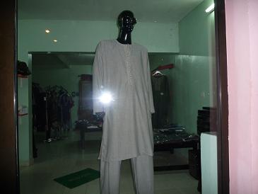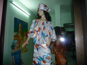 近くをぶらっと散歩してみると、果物を売る露店やファーストフードの店、閉まっていましたが服飾店などが点在しています。服飾店のショーウインドウには、典型的なセネガルの服装が飾られていました(写真)。