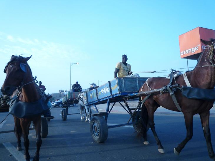 7日は、「Day of Africa and Diasporas」ということで、アフリカに関するワークショップやイベントが開かれることになっています。私は、茂住さんと一緒に、ノボテルホテルへ。梅田章二さんらのグループと合流するためです。茂住さんがセネガルの状況についてレクチャーを頼まれていたので、それに同行しました。ノボテルホテルは、港の近くにあり、そこまではハイウエーを飛ばした後、市街地に入ると急に砂利道に入ります。ハイウエーは膨大な費用を投じて、現大統領が建設したのですが、その入り口付近では車に混じって馬車が堂々と通っていました(写真)。途中では、派手なクラッシュの跡があり、しかも横断歩道がなく(所々に歩道橋はありますが、あまり使われていません)、車の合間を縫って人々が横断するため、さぞかし事故が多いだろうなとつい心配してしまいます。
