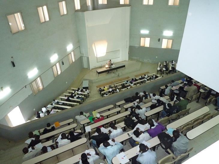 会場のダカール国立大学は、正式名称を「シェイク・アンタ・ジョップ大学」といい、セネガルのみならず西アフリカでも有数の大学で、大学構内には多くの学生寮があり、西アフリカ全域から学生が集まっているそうです。広大なキャンパスには、数多くの建物があり、そのうちの一つで登録が行われていました。私たちも行列に並びました(写真)。