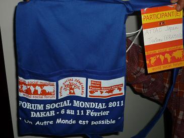 登録が終了すると、青いバッグと参加証がもらえます(写真)。登録料は、私たちはATTACとしての団体登録は8人で195ユーロ、つまり一人当たり約25ユーロ(約4000円)、アフリカからの参加者は個人が5ユーロ、セネガルの参加者は団体が2ユーロ、学生・青年が0.5ユーロ、一般市民は0.25ユーロ(約40円)となっていました。この差のつけ方は、WSFナイロビの教訓から学んだものでしょうか。