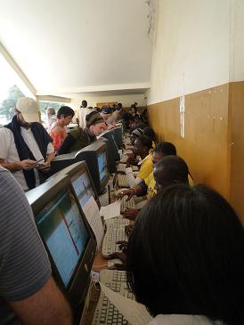 ボランティアスタッフが、コンピュータを前にして行列を作った参加者の登録作業に奮闘していましたが、ポルトアレグレやベレンに比べると、コンピュータの数も少なく、明日以降は結構混雑が予想されます(写真)。