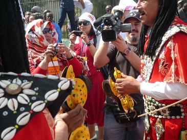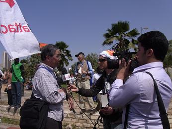モロッコのテレビ局らしい人から、インタビューを受けました。「はるか遠い日本から、なぜWSFに参加しているのか」「経済状態が悪いが、どうすれば脱却できると思うか」など聞かれました(写真)。どうも日本から来たということが珍しいらしく、一緒にいたATTACメンバーも何回かインタビューに応じていました。
