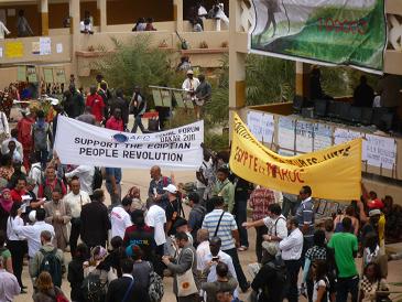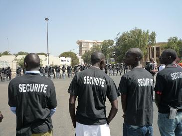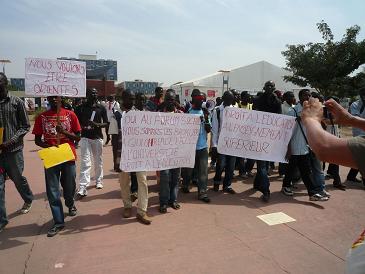 これまでのレポートで、会場の大学では授業とWSFが同時並行で行われていると書きましたが、その理由がわかりました。それは、大学当局がWSF開催に協力的でないから、だそうです。セネガルのBadouさんによれば、セネガル政府は公式的には、WSFを歓迎するという立場なのですが、裏では大学当局に圧力をかけて、施設の利用などで大きな便宜を図らないようにしていたのです。そのために、学生たちもWSFへの参加に消極的とのことでした。ダカール国立大学の教育環境の悪さは想像以上で、以前は25,000人だったのが、現在は60,000人がいて、午前5時頃から教室で座席を確保しなければならないほどだということです。今日も、教育条件の改善を訴える学生たちのパフォーマンスがありました(写真)。