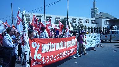 デモの出発時刻については、13時とか、14時とか、いろんな情報が事前に流れていたのですが(大学の登録場所には、13時というアナウンスが、スペイン語、ポルトガル語、フランス語、英語の4カ国語で張り出されていました。英語が一番下というあたりが、WSFでの英語圏の占める位置を象徴していますね)、結局14時だったようです。こういう流れで、ランチを食べ損ねてしまい、かつ空港で両替してもらった現地通貨が高額紙幣(といっても、10,000シェーファーフランですから、2,000円くらいですが)だったので、水を買うこともできず(露店ではお釣りの持ち合わせがないから)、これが大失敗でした。