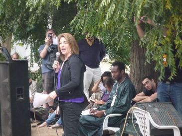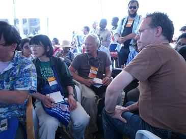 16時から、ダーバン(南アフリカ)でのCOP17(今年11月〜12月)に向けてのワークショップで、ナオミ・クラインが発言するというので、会場に行きました。さすがに彼女の人気はすごく、テントの中は超満員で外にも人があふれています。ただ、参加者のほとんどは白人でした(写真)。残念ながら、ナオミ・クラインのアメリカ英語が聞き取りにくく、内容の10%程度しか理解できませんでした。