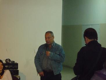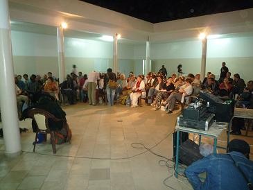 7日夜は、ATTACのイベント兼パーティーが開かれ、会場から徒歩で約45分の文化センターまで行きました。予定時刻の7時から約1時間遅れで始まったイベントには、各国のATTACメンバーを中心に100名以上が集まりました。ATTACフランスとATTACトーゴの仲間が司会で、まず各国の取り組みを紹介しあいました。ほとんどがフランス語で進行し、英語の通訳がドイツなどヨーロッパの一部に対して、スペイン語の通訳がラテンアメリカに対して行われていました。日本からは、No−voxの稲葉さん、園さんも合流し、稲葉さんに日本語への通訳をしていただいたので、内容がよくわかりました。