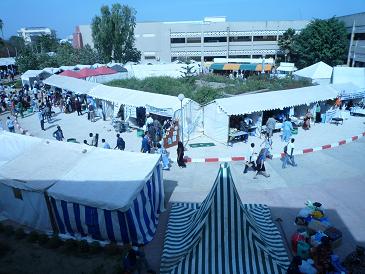 昨日のレポートで、会場がいつもより狭いのではないか、と感想を書きましたが訂正します。昨日は、会場地図がプログラムに載っていないのと会場内にも地図の掲示がなかったので、自分たちのいるところだけが会場と思い込んでいましたが、実はキャンパスのあちこちにテントが張られていたり、教室を使ったりして、大学構内の数ヶ所に分散していたのです(写真)。