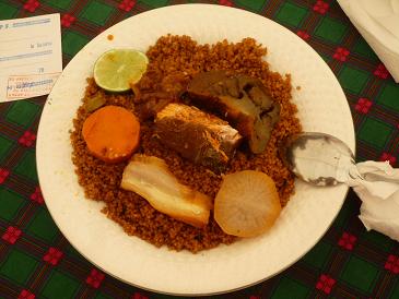 それ以外に、食事をするフードコートがあり、セネガル料理やサンドイッチ(フランスパンに肉や野菜を挟み込む)、飲み物などが売られています。今日の昼食は、チェブジェンという油で炒めて味をつけた、日本の炊き込みご飯を油っぽくしたようなライスの上に、ダイコンやニンジン、ナスビ(?)などの野菜や魚を煮込んだものがトッピングされた料理を食べました。結構おいしかったです(写真)。