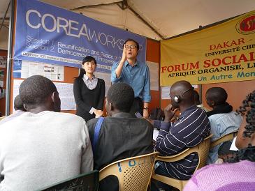 いつもは韓国民主労総(KCTU)が代表団を送り込んでいるのですが、今回は彼らだけだそうです。スピーカーはハングル、あるいは英語でしゃべり、フランス語に通訳するスタイルでした。置かれているスピーチ原稿を読むと、民主労働党内の「親北朝鮮派」のようです。アフリカの活動家にとっては、朝鮮再統一問題は初めて聞く問題なのか、質問が途絶えることなく出されていて、スピーカーはハングルで答え、若い女性の通訳が的確に(多分)フランス語に直していました。私にはちんぷんかんぷんだったので、終わってから、どんな質問が出たのか、メンバーに聞いてみると、「韓国は繁栄しているのに、どうして再統一しようとするのか」など素朴な質問だったとのこと。